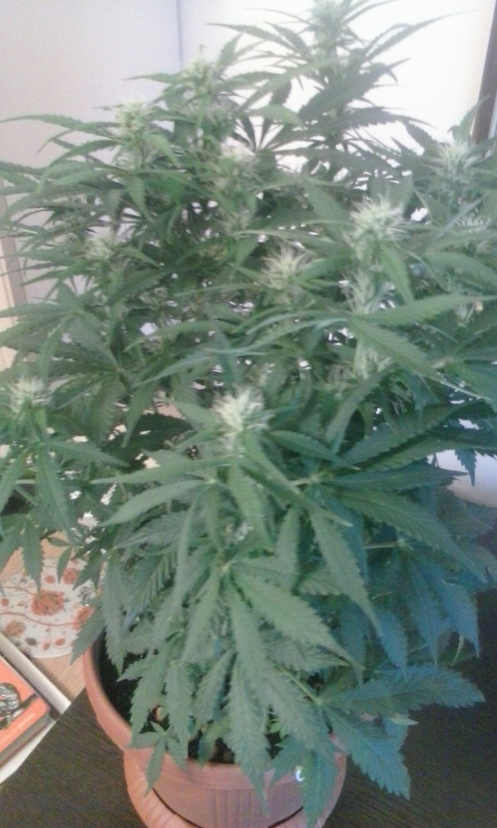 всем привет садоводам!моей малышке 27дней как скинула шапочку уже цветет,рост 60 см пахнет не скажу чтоб сильно, под светом днат250 режим 20:4 на вегатации поливал только зольной водой,сейчас удоброй простой из цветочного магаза.