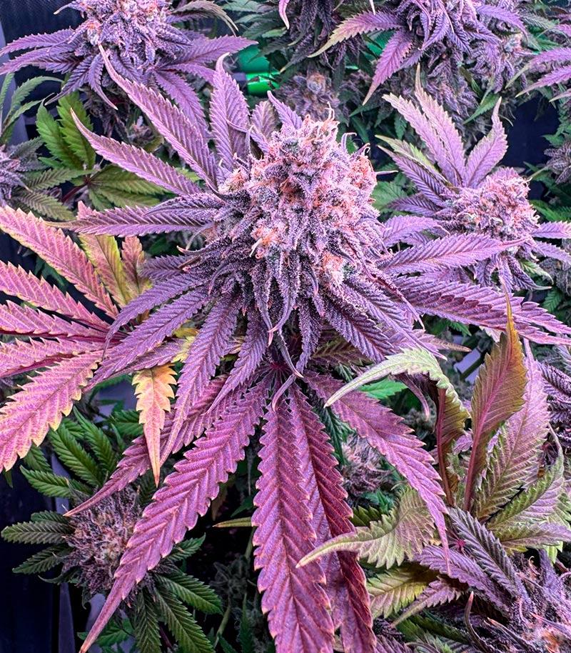 Где-то за 3 недели до сбора урожая сдержанная палитра окраса куста разбавляется утонченными оттенками темно-фиолетовых цветов. Оторвать взгляд от подобной картины достаточно сложно, особенно если учесть, как красиво играют бликами темные цвета крупных чашечек в преломлении света от белых трихом. Идеальный сорт для экстракции.