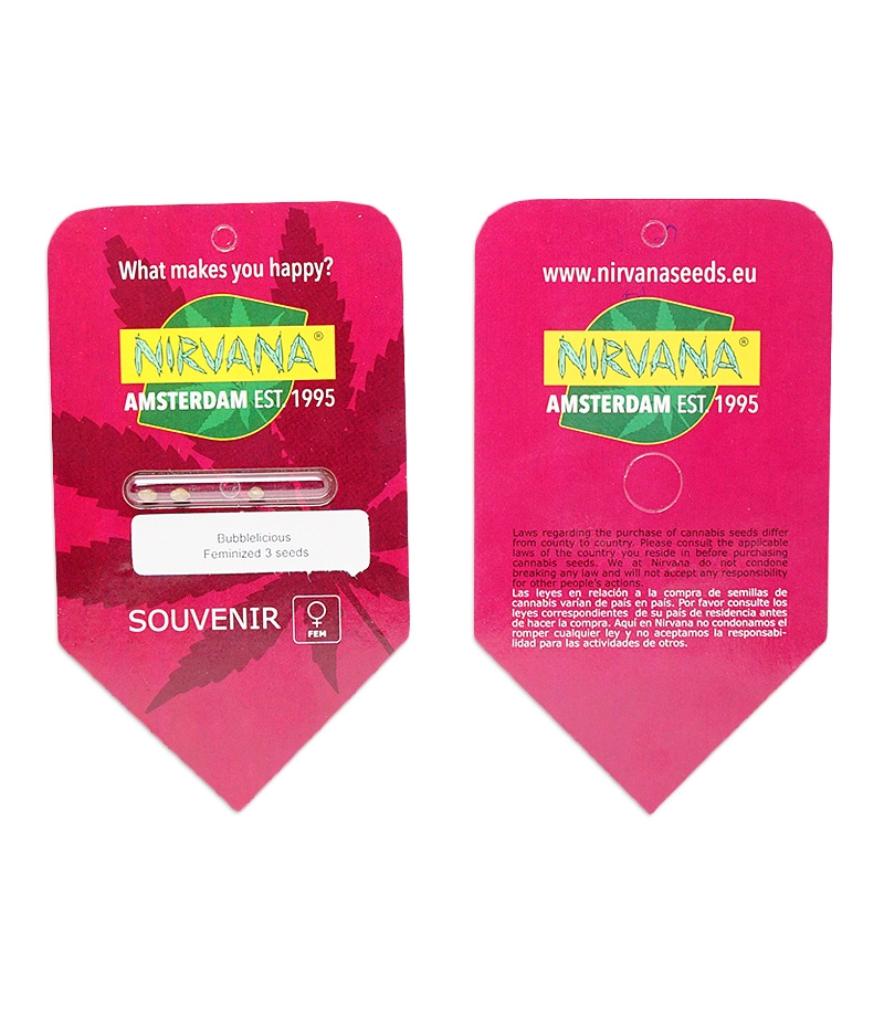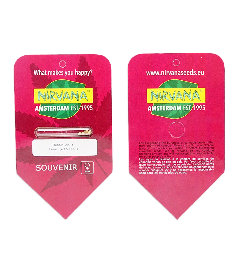 Семена конопли Bubblelicious fem от Nirvana. Чемпионский сорт, рекомендован для индора, где растет энергично и спустя 8-9 недель цветения выдает 400-500г/м2.