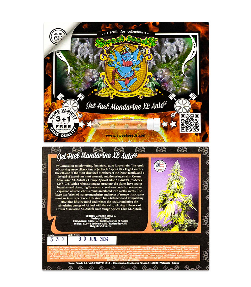 Мы рады представить вашему вниманию сорт Jet Fuel Mandarine XL Auto, долгожданное пополнение коллекции сортов с американской генетикой от испанской компании Sweet Seeds. Разработка этого гибрида отняла у создателей не один месяц упорного труда. Им пришлось преодолеть десятки провалов, чтобы вывести идеальную формулу и произвести на свет настоящий шедевр мирового уровня.