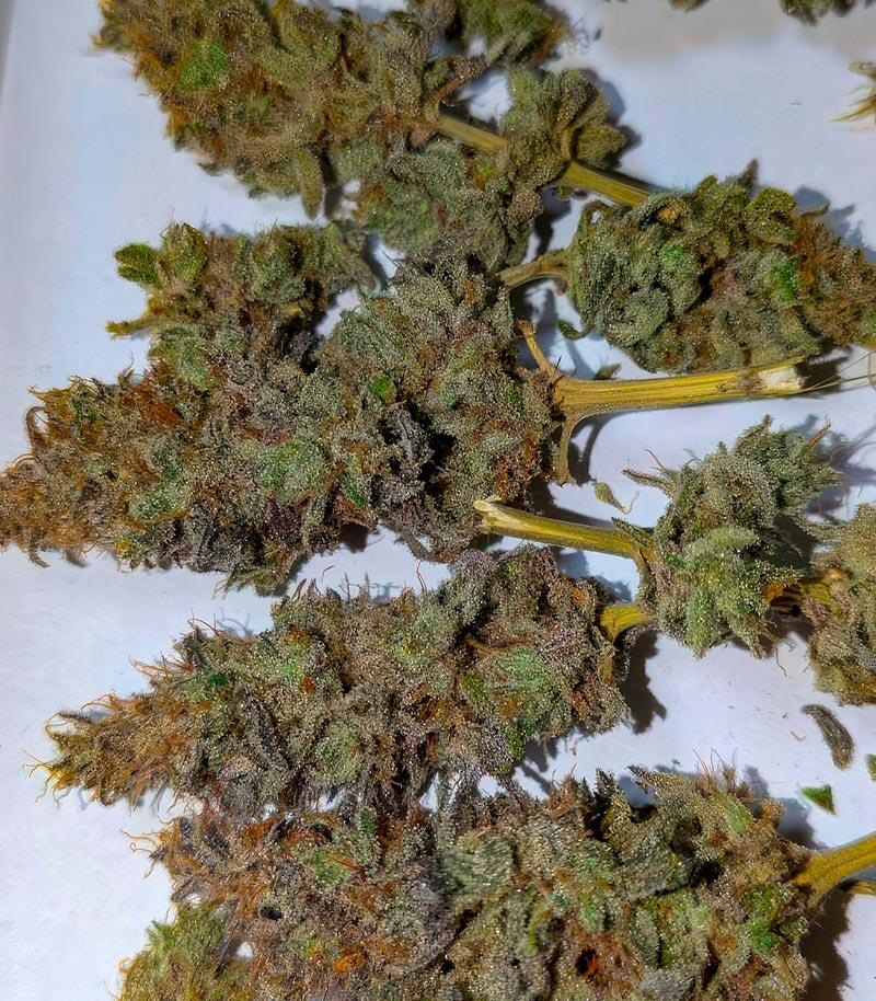 Каннабис Papaya Frosting приятно удивляет не только яркими вкусовыми качествами, но и покладистым характером. Это один из тех сортов, с которыми работать – одно удовольствие. Он крепкий, стрессоустойчивый и почти не подвержен болезням. В гроуруме растения остаются компактными, вырастая примерно до 100-110 см, тогда как под открытым небом могут вытянуться до 1,5-1,8 м, сохраняя при этом плотную аккуратную форму. Крона мощная, симметричная, с толстыми ветвями и насыщенной темно-зеленой листвой, на которой нередко проступают фиолетовые прожилки. Шишки крупные, тяжелые, плотно набитые и полностью покрытые белыми кристаллами смолы, из-за которых кусты действительно выглядят припорошенными инеем.