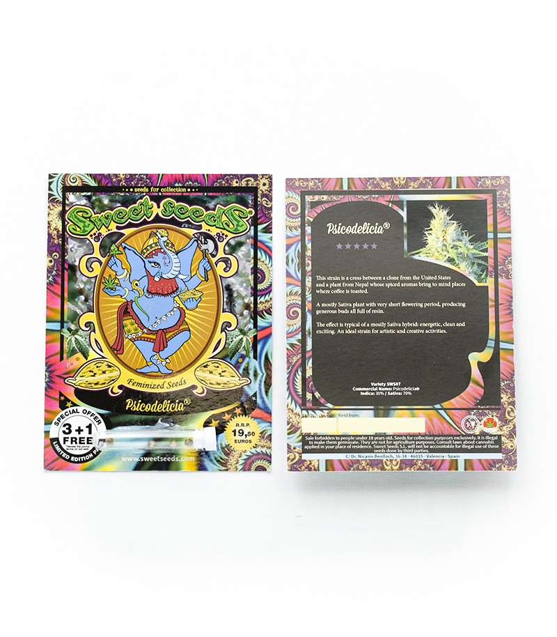 Растения сорта Psicodelicia обладают интенсивным и сладким вкусом, который, однако, совсем не похож на все другие сладкие сорта. Попробовав его, вы почувствуете оттенки всех цитрусовых с кофейным привкусом. Содержание ТГК достигает 20%. Воздействие мощное энергетическое, захватывающее и головокружительное. Этот сорт подходит для творческих мероприятий и встреч.