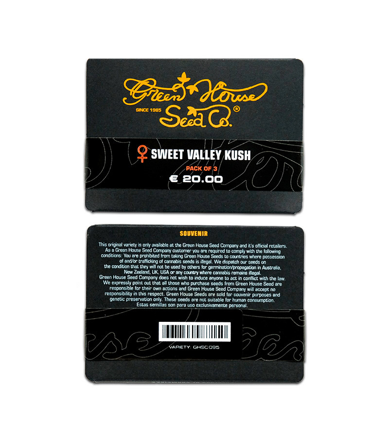 Сорт Sweet Valley Kush – индика доминантный каннабис с ТГК 24,10%. Подходит для партизанского гровинга. В конце цветения могут сильно потемнеть. В индоре дает 800 г/м² урожая, в аутдоре – до 1 кг/куст. Аромат и вкус сладкие ягодные с землистой кушевой ноткой. Эффект мощный Stone.