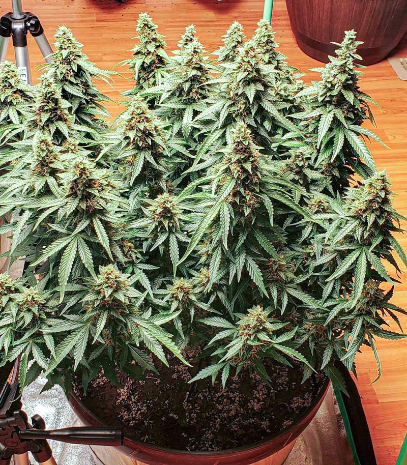 Кусты отличаются средними размерами. В индоре для них вполне подойдут горшки на 11-12 литров. Рост при этом составит 90-130 см, что позволяет не испытывать сложностей с тренировками. Урожайность может достигать отметки в 450-600 грамм шишек с квадрата. Боковые ветви куста развиваются очень активно, на них формируется множество шишек, густо усыпанных трихомами. Благодаря обильной смолистости соцветия идеально подходят для приготовления концентратов любого вида.