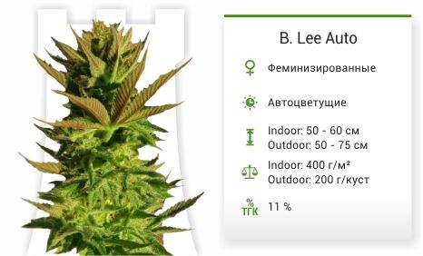 Совсем кроха по размерам и вообще не детский по урожаю и его силе! Этот полуметровый малыш - лучший выбор для скрытого микрогровинга. Сорт конопли B. Lee Auto самостоятельно зацветает и готов к сбору спустя 65 дней от всхода. Итоговый выхлоп впечатляет - может достигать 400 гр/м2! От него стоит ожидать крепкого прихода с характером индики, но все-таки доля рудералиса делает свое дело, не позволяя Би. Ли окончательно надрать вам зад!