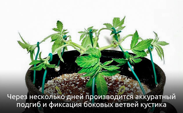 • Спустя несколько дней после этого можно начинать гнуть боковые ветви и подтягивать до горизонтального положения центральный стебель. Не надо стараться согнуть все побеги сразу до желаемого положения, это можно делать постепенно. При необходимости дайте конопле время для восстановления.